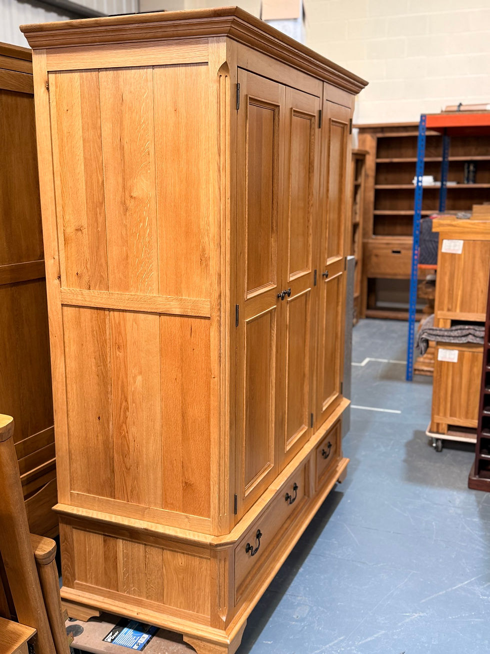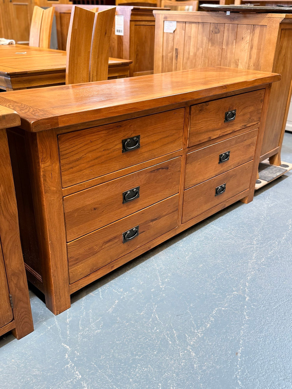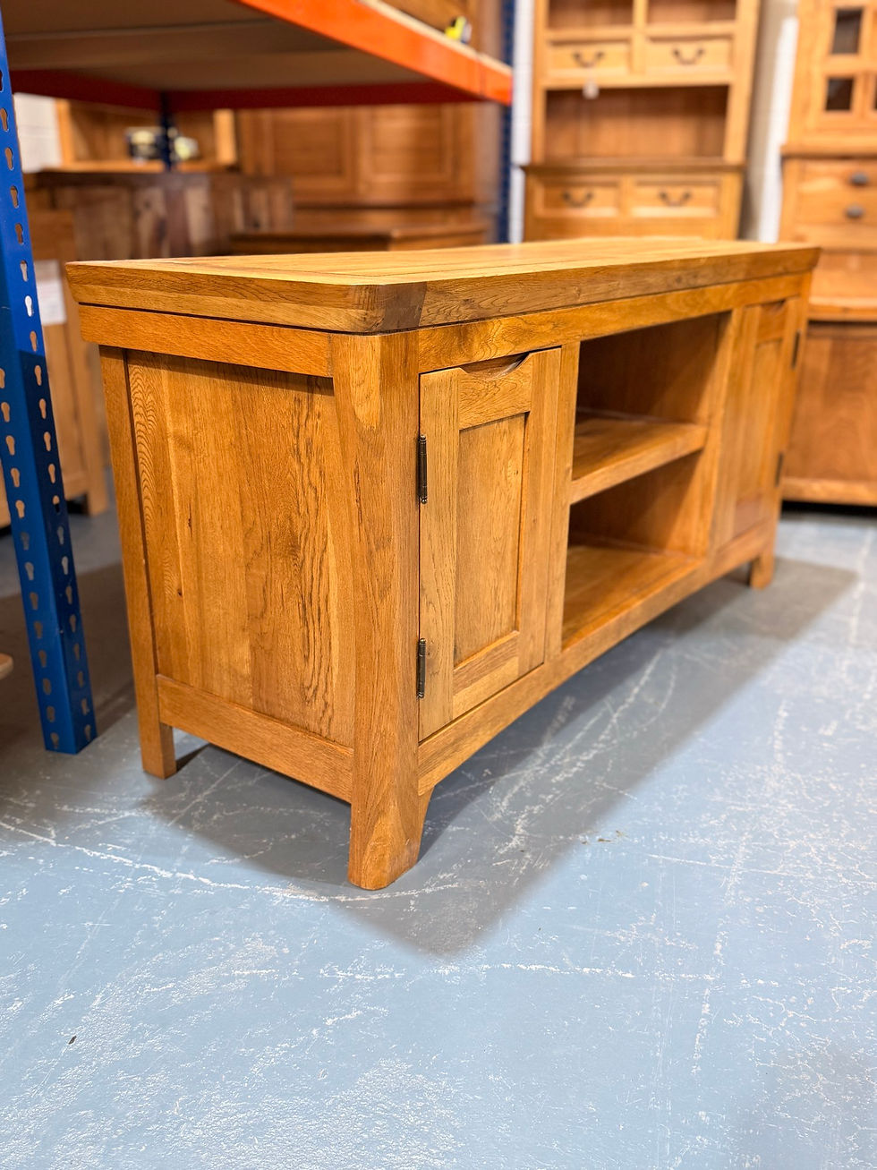 This French Farmhouse Solid Rustic Oak Large Sideboard, originally supplied by Oak Furniture Land is in excellent Pre-Loved condition, the option to change the handles to a different finish is available. It has 3 drawers and 3 large cupboards accessed with shelves inside. It’s an elegant sideboard suitable for any room.
