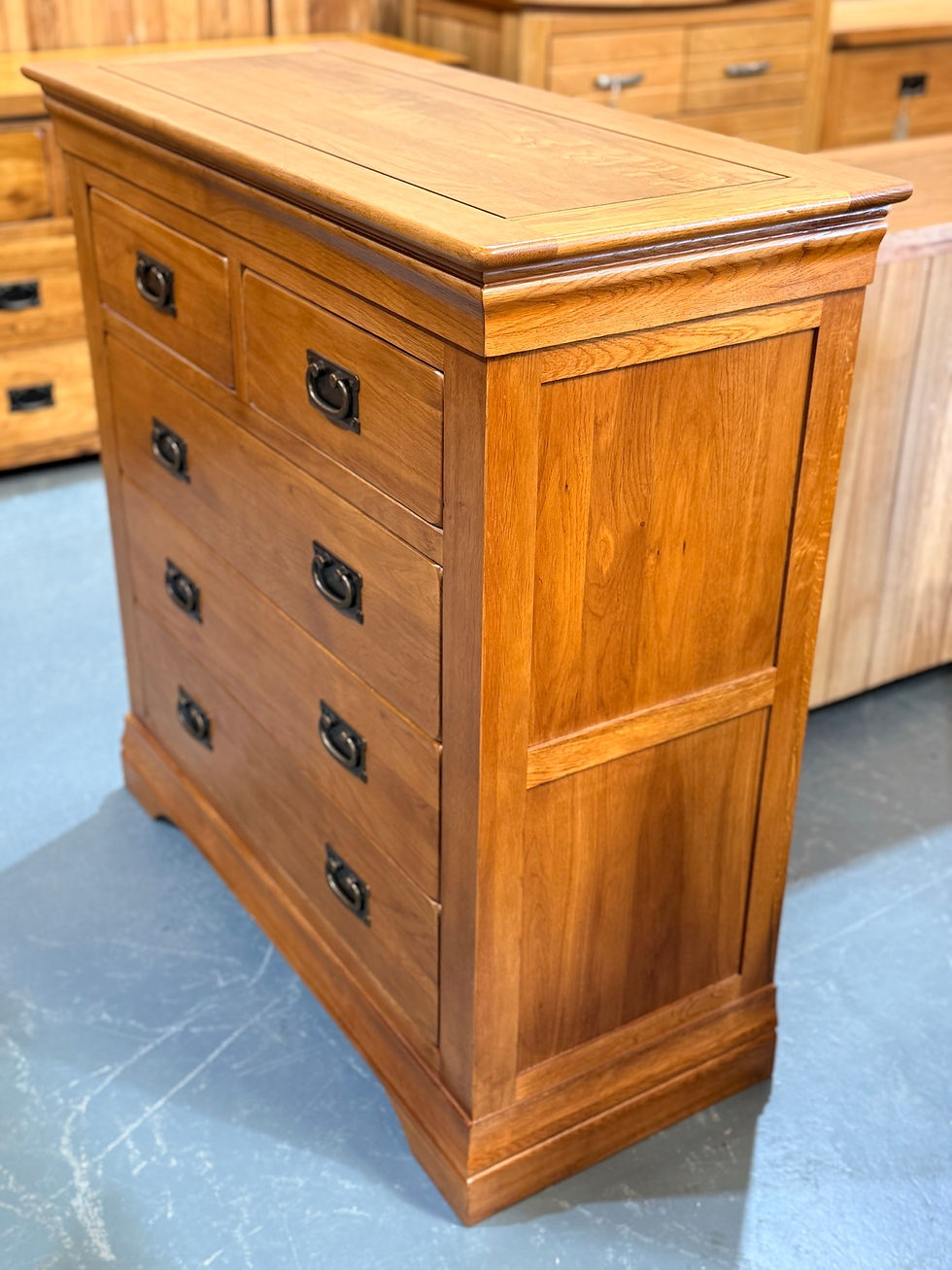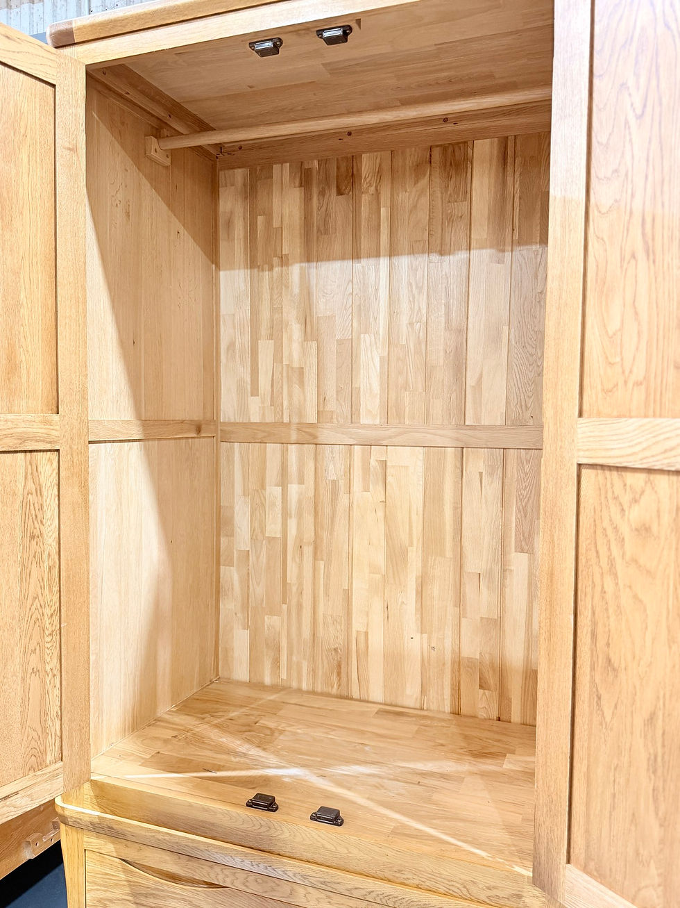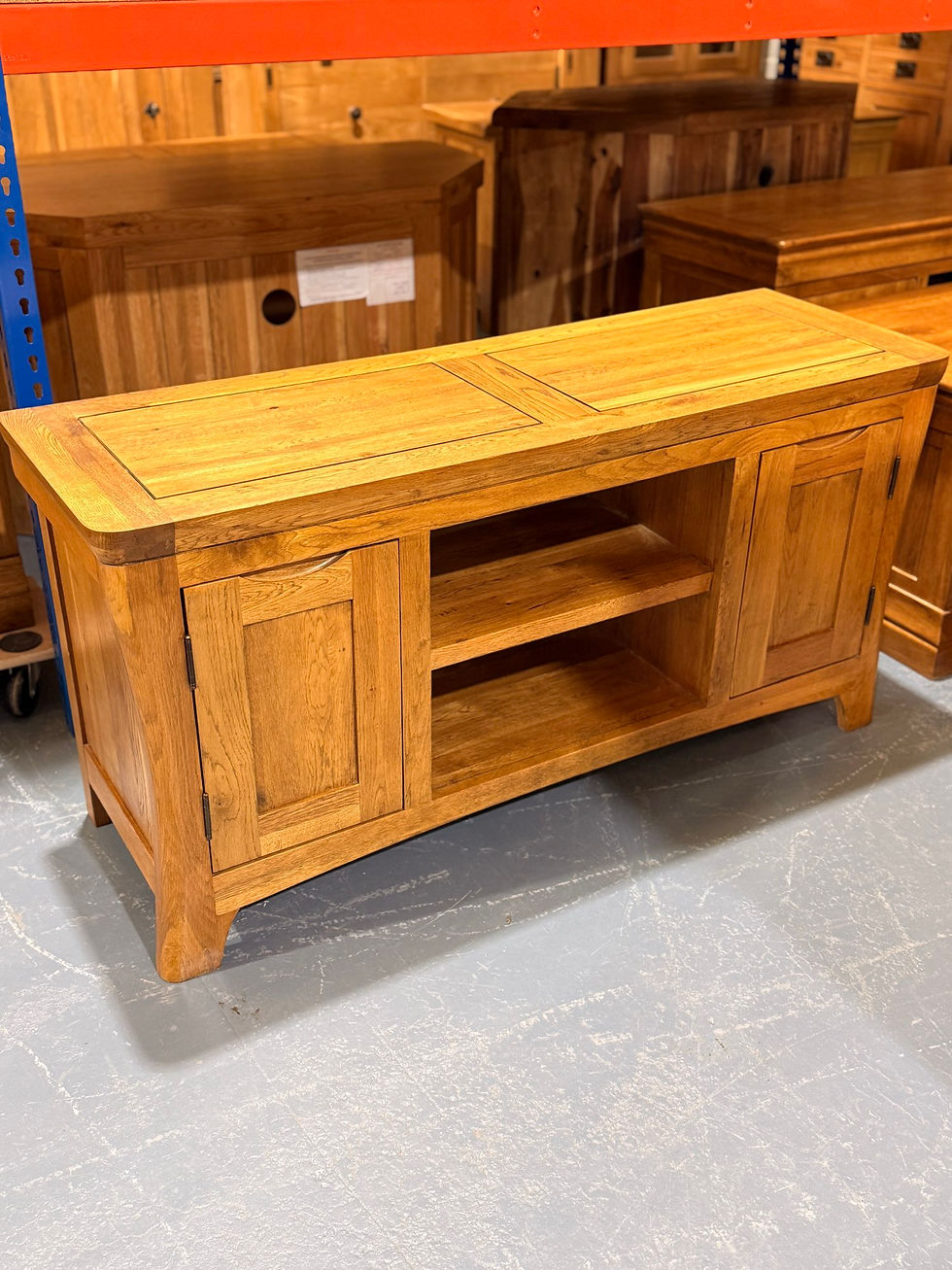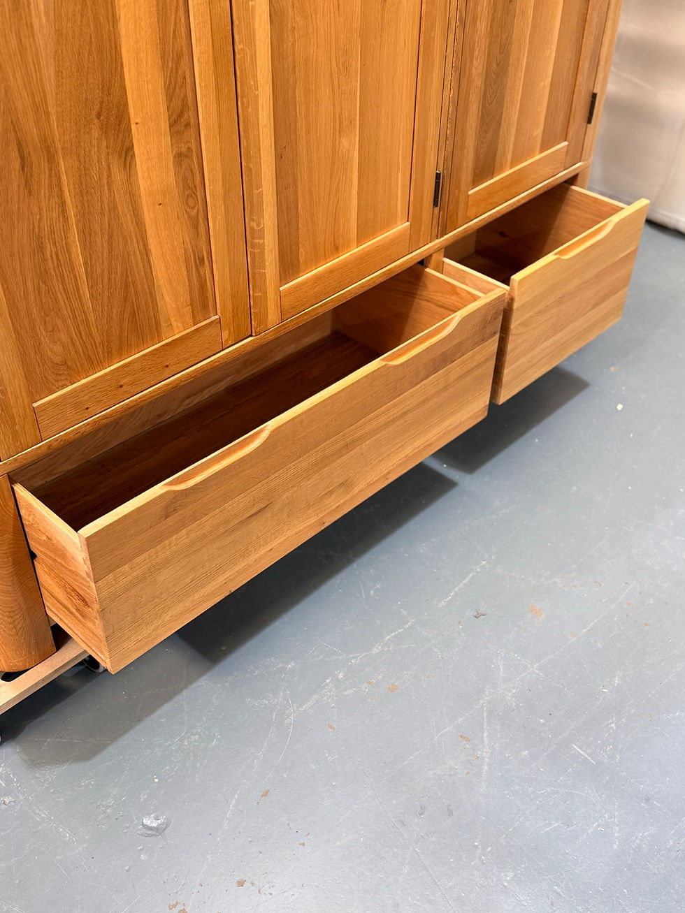 This French Farmhouse Solid Rustic Oak Large Sideboard, originally supplied by Oak Furniture Land is in excellent Pre-Loved condition, the option to change the handles to a different finish is available. It has 3 drawers and 3 large cupboards accessed with shelves inside. It’s an elegant sideboard suitable for any room.